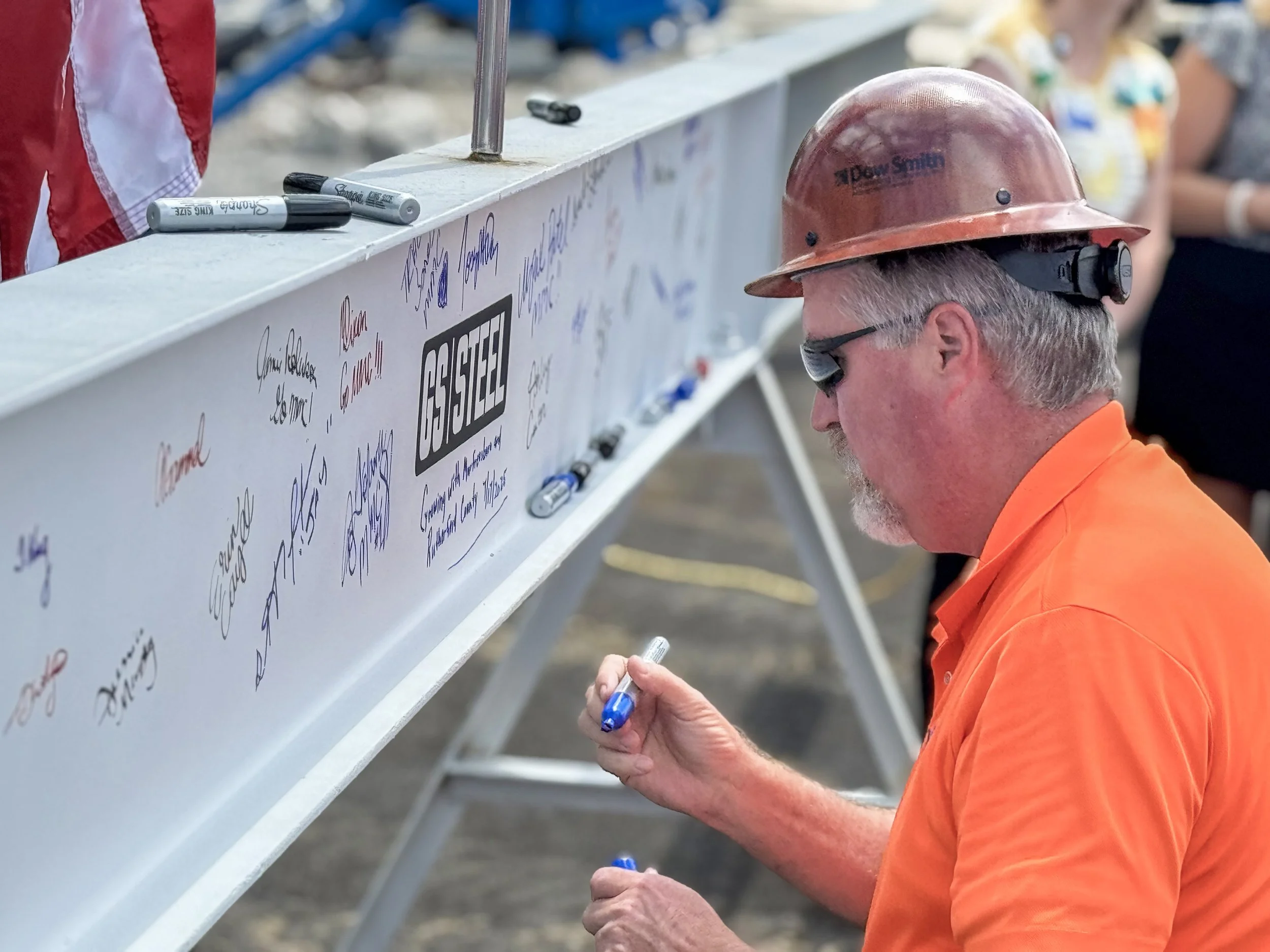 Murfreesboro Medical Clinic CEO Joey Peay signs the final steel beam during the topping out ceremony for MMC’s latest project.