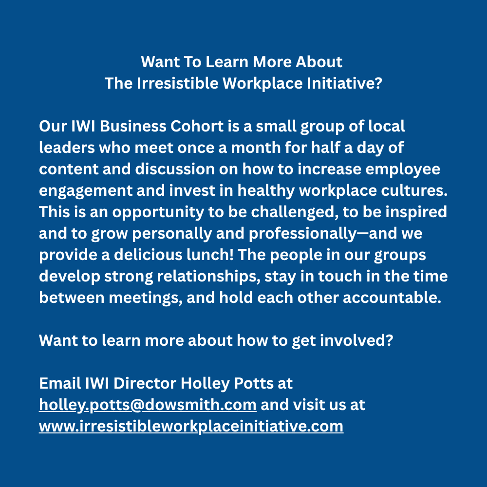 The Irresistible Workplace Initiative (IWI) is an organization that specializes in consulting and connecting small businesses in an effort to increase employee engagement and define company culture.